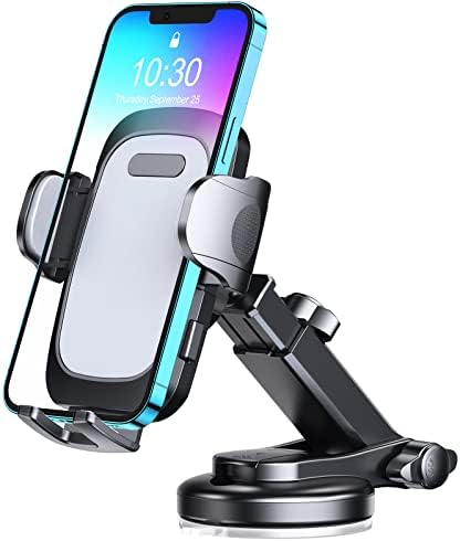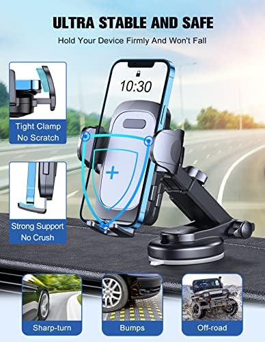 【Multi-function Phone Mount】: This phone mount for car can be mounted to your car dashboard, windshield, table or other flat surface, all places work perfectly. Features a one-button release system that enables you to release your phone with just one hand.