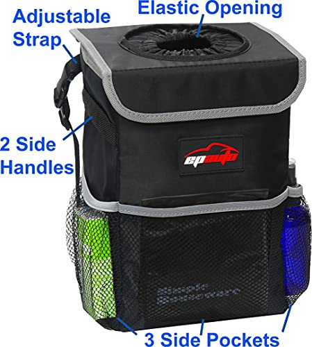 EPAuto Waterproof Car Trash Can with Lid and Storage Pockets, Black