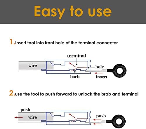 【Easy to Use】 The electric pin remover tool is easy to use, just push and pull the terminal pins with connector removal tool for removal effortlessly from the wire harness connectors without any damage.The O ring handle make it more safe to operate the terminal pins connectors