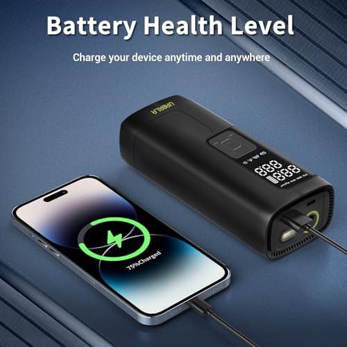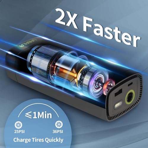 2X FASTER INFLATION:Refer to turbo design and equipped with a high-performance chip, this portable air compressor for car tires can provide up to 150 psi pressure and refill a 175/70R14 car tire from 0 to 35psi less than 5 mins. The speed is 30% faser than others on the market.