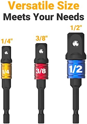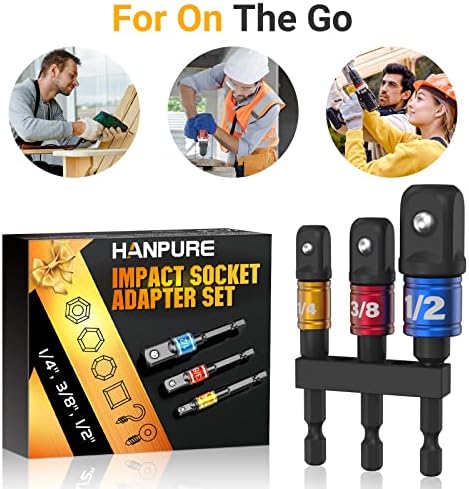Versatile Impact Socket Set for Most Tools: HANPURE Drill-accessories are huge in variety and practicality. Whether it’s a screwdriver, electric drill, universal socket, or cordless impact driver, these impact driver bit set will drive pretty much all size of sockets and come in handy. With this drill to socket adapter, the options for your impact drivers and guns are almost endless. This is an easy way to adapt sockets on to your impact. A must piece of equipment in your tool box.