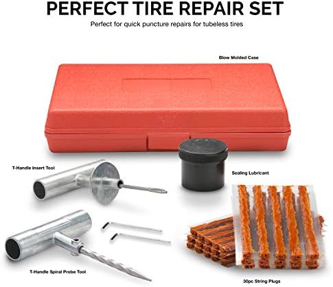 COMPLETE SET INCLUDES: This tire repair kit with plugs comes in a blow mold case that keeps organizing your plugs, and repair tools easy. Each kit includes: 1 T-handle insert tool, 1 T-handle spiral probe tools, 2 Hex keys, 30 String plugs